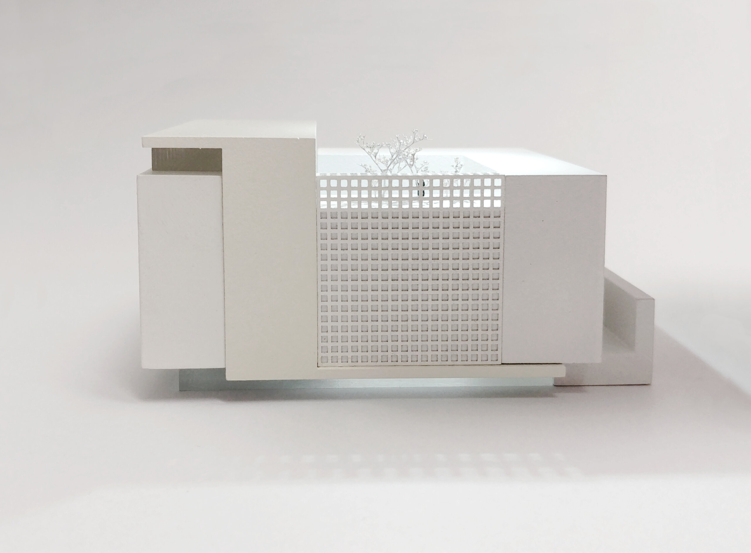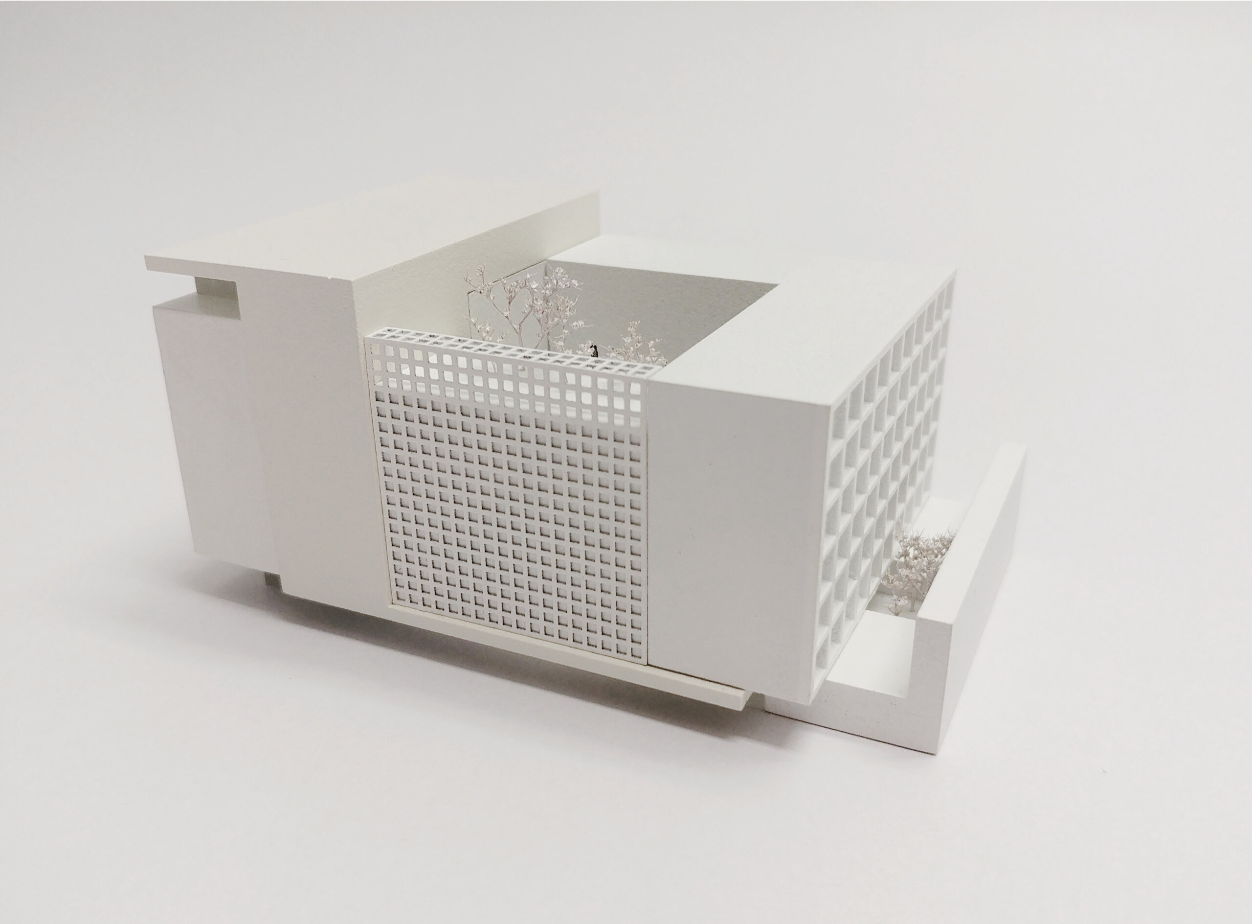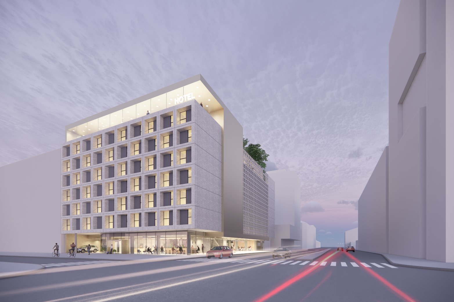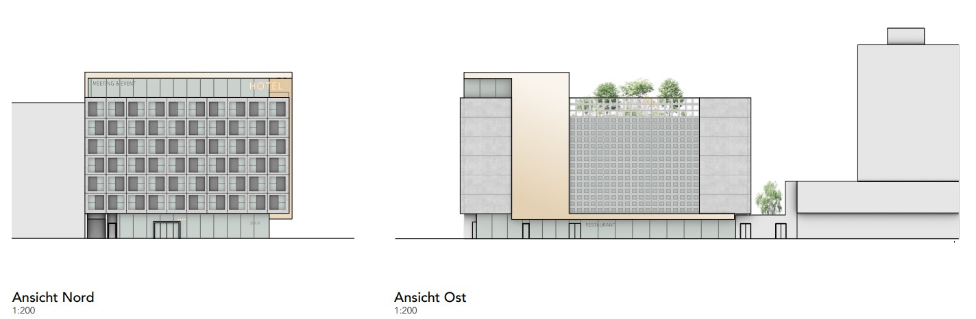 Das Entwurfsmotiv fokussiert auf die Präsenz des Gebäudes im Eckbereich. Die wabenförmige Struktur der Fassade in der Annenstraße bildet die dahinterliegenden Zimmer ab. Das Thema wiederholt sich an der Südseite. Die Tiefe der vorgehängten Betonelemente kontrastiert mit der glatten Oberfläche entlang des Gürtels. Die metallische 'Klammer' verbindet formal das Konferenzzentrum ganz oben mit dem Restaurant. Hinter dem vertikalen Element verbirgt sich eines der beiden Fluchttreppenhäuser. Die anschließende Gitterstruktur in den Proportionen des großen Rasters deckt den Bereich der Laubengänge ab. Die Kombination dieser Elemente ergibt eine großzügige und ausdruckstarke Komposition, die sich im Kontext der mächtigen Nachbargebäude behauptet. Dem zugrunde liegt die prinzipielle Entscheidung, die Zimmerfluchten am Gürtel in den begrünten und ruhigen Innenhof zu orientieren.