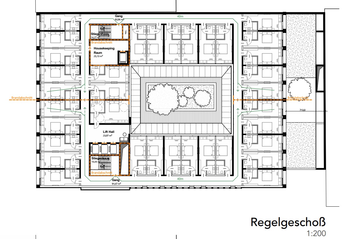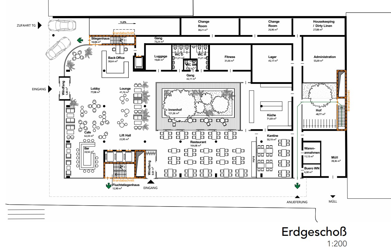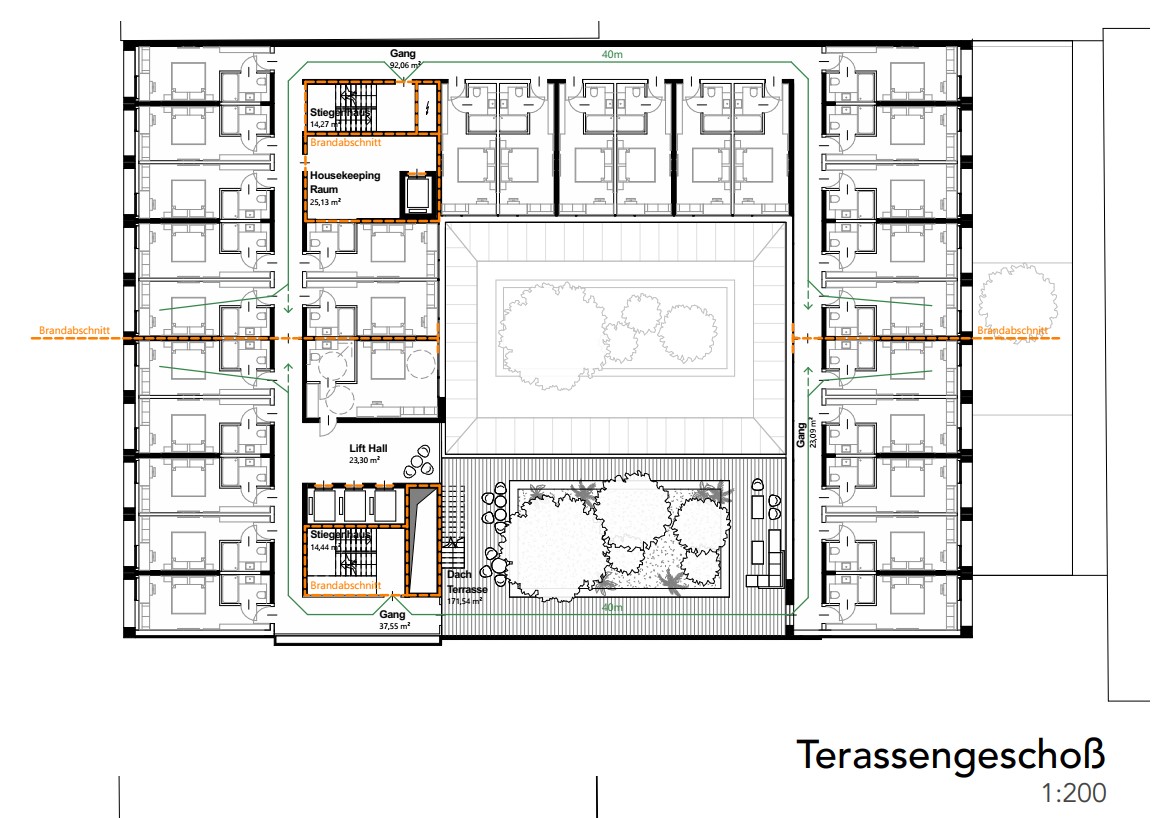 Die Organisation der Grundrisse folgt der Logik des Raumprogrammes. Lobby, Cafe und Restaurant werden nach außen präsentiert, wobei die Durchsicht zum Innenhof von beiden öffentlichen Seiten gegeben ist. Die naheliegendste Funktionseinheit, die durch das Flächendefizit im Erdgeschoss in das attraktive Dachgeschoss ausgelagert werden kann, ist das Konferenzzentrum mit Blick auf Schloßberg und Bahnhofsvorplatz. Die vier Räume können für größere Veranstaltungen mit der Lobby davor zusammengeschaltet werden. Den Gästen wird nicht nur ein Überblick über die Stadt geboten, sondern auch die Ruhe und Konzentration in einem klar abgegrenzten Bereich. Die Planung der Zimmer folgt der Ausschreibung. Die ringförmige Erschließung erfüllt die brandschutztechnischen Erfordernisse und ist an zwei der vier Schenkel natürlich belichtet. Der Vorbereich der Lifte wird durch die Sichtbeziehung in den Innenhof aufgewertet.