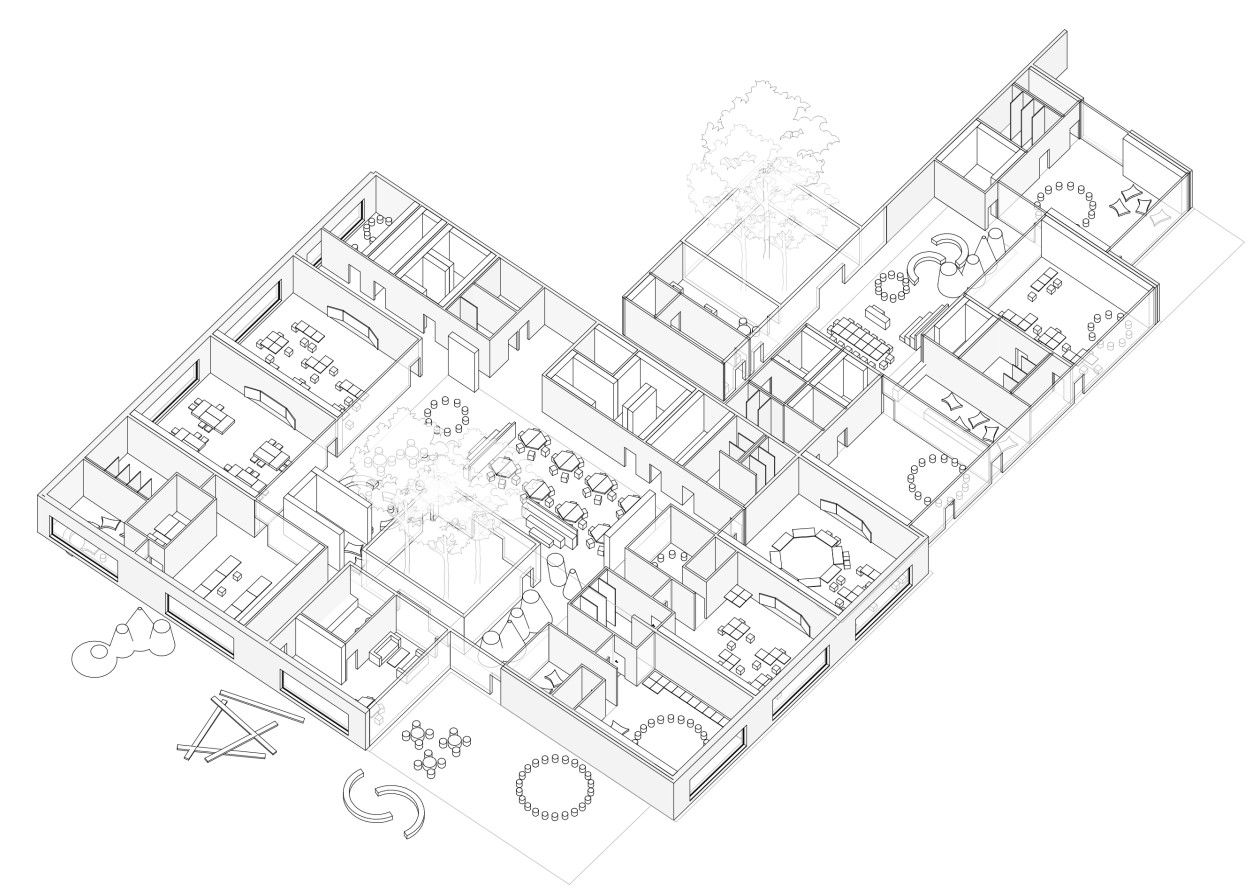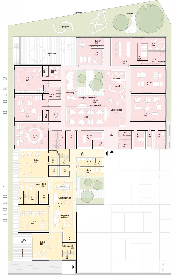 Die Charakteristik der eingeschoßigen Bildungsbereiche basiert auf der grundrisslichen Organisation um ein Atrium. Dieses stellt die optimale natürliche Belichtung der Kernzonen sicher und dient als zusätzlich bespielbare Fläche. Die Mufus haben aber auch Bezug zum Außenraum, insbesondere zu den vorgelagerten Freibereichen. Die Situierung des Teamraums folgt der Logik der Übersichtlichkeit und guten Einsehbarkeit der allgemeinen Flächen und der kurzen Wege. Die Essbereiche der Volksschule liegen wie die Garderoben unmittelbar beim Eingang, über den die Speisenversorgung erfolgt. Durch Ausbildung eines teilverglasten Schwellenbereichs zwischen Bildungsraum und Mufu soll die Kommunikation im Biber gefördert werden. Ziel ist das Gefühl eines großzügigen Raumverbandes mit Ein- und Ausblicken zur besseren Orientierbarkeit für die Kinder und der erforderlichen Übersichtlichkeit für das pädagogische Personal. Bei der Volksschule werden durch die außenliegenden Fluchttreppen die exlusiven Freiflächen miteinander verbunden und können sowohl übergreifend als auch separat bespielt werden.