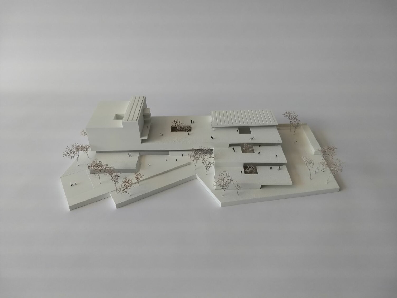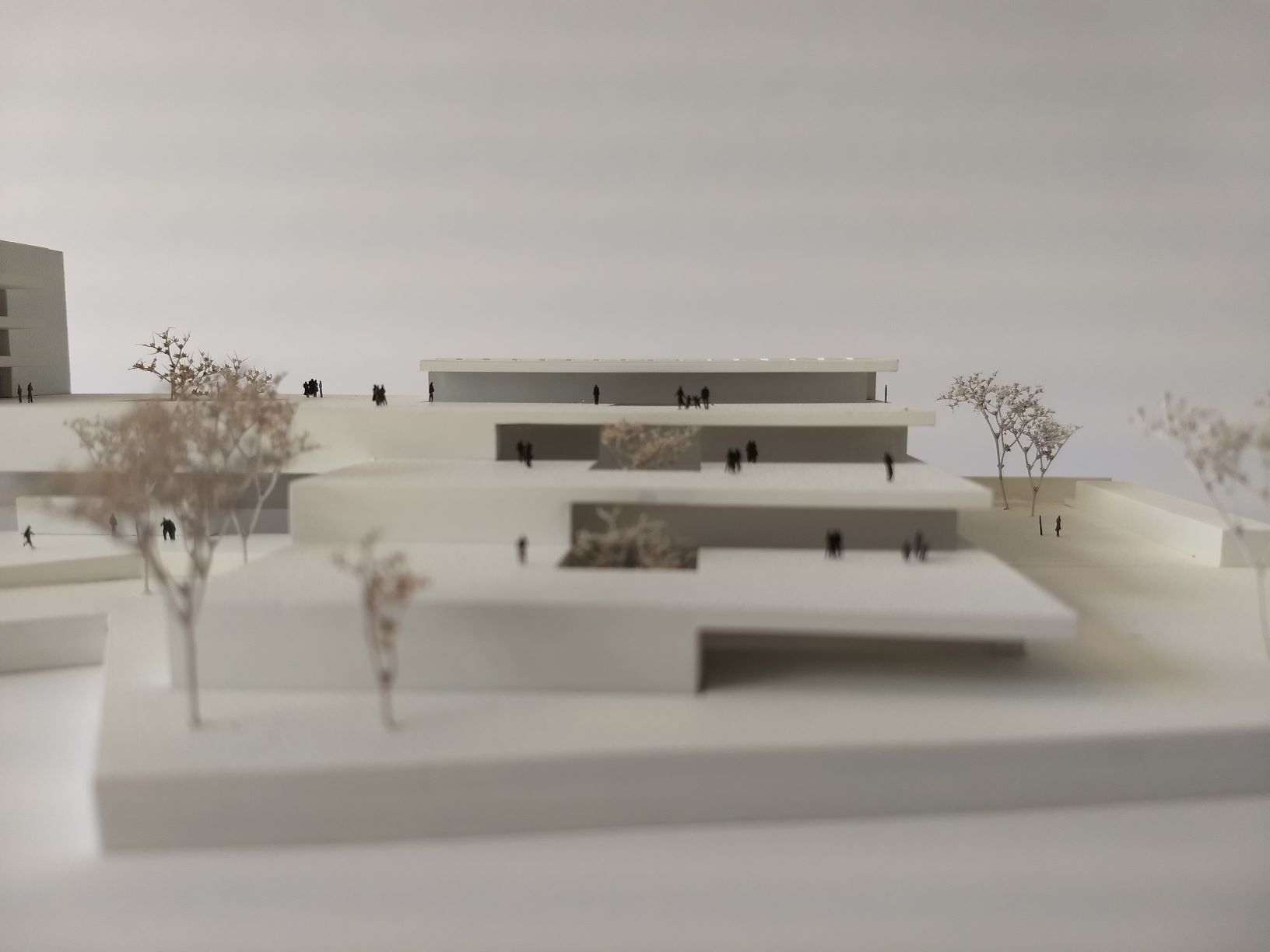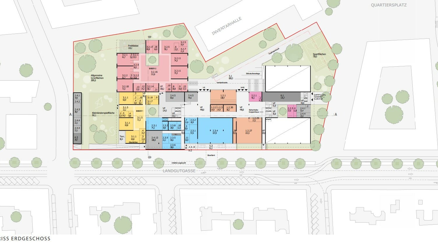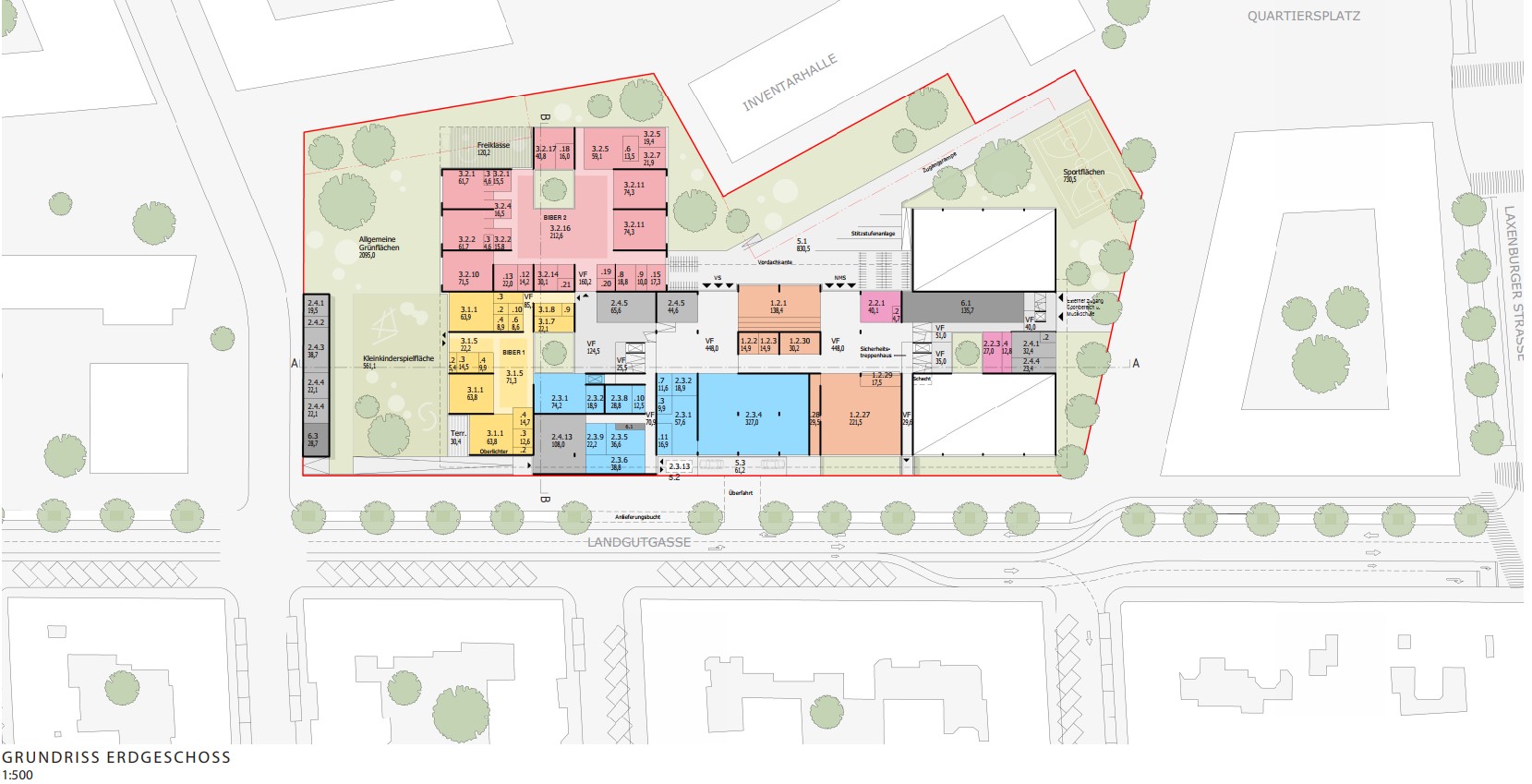 Zwei äußere Bedingungen bilden die Grundlage für den vorgeschlagenen Entwurf; die unterschiedlichen Niveaus von Straße und Campus-Gelände und der Zuschnitt des bebaubaren Areals. Das Gebäude wird in Fortsetzung des Bestandes im Westen an die Landgutgasse gesetzt. Während es im Westen terrassenförmig in das Gelände eingebettet ist, wird am östlichen Ende beim Zugang zum Quartiersplatz durch die Geschoßigkeit ein städtebaulicher Akzent gesetzt. Diese Grundintention der Baumassenverteilung folgt der Logik der inneren Organisation; der Situierung der Volksschule und der Kinderkrippe mit unmittelbarem Freiraumbezug im Westen und der Lage der neuen Mittelschule im Osten.