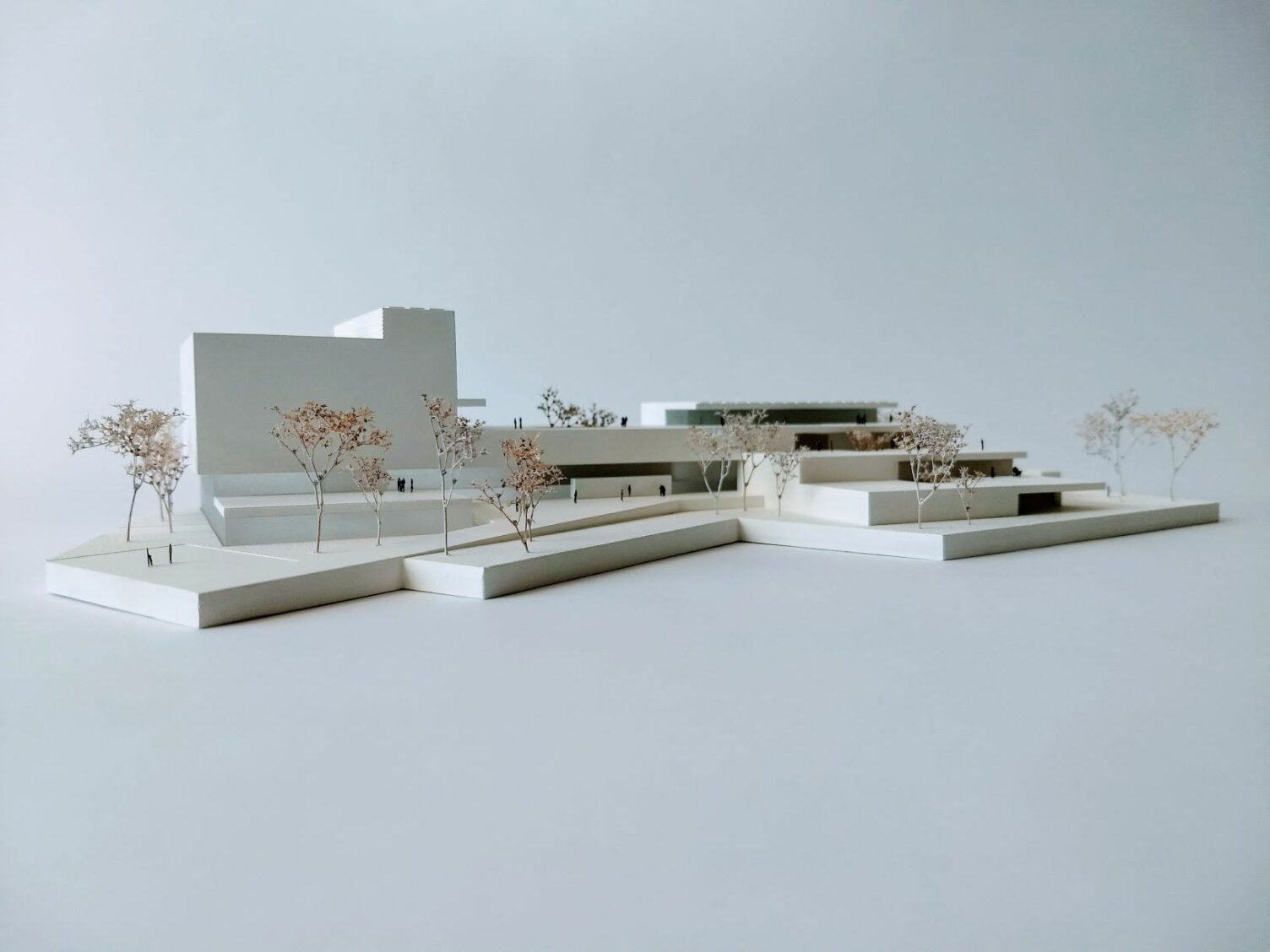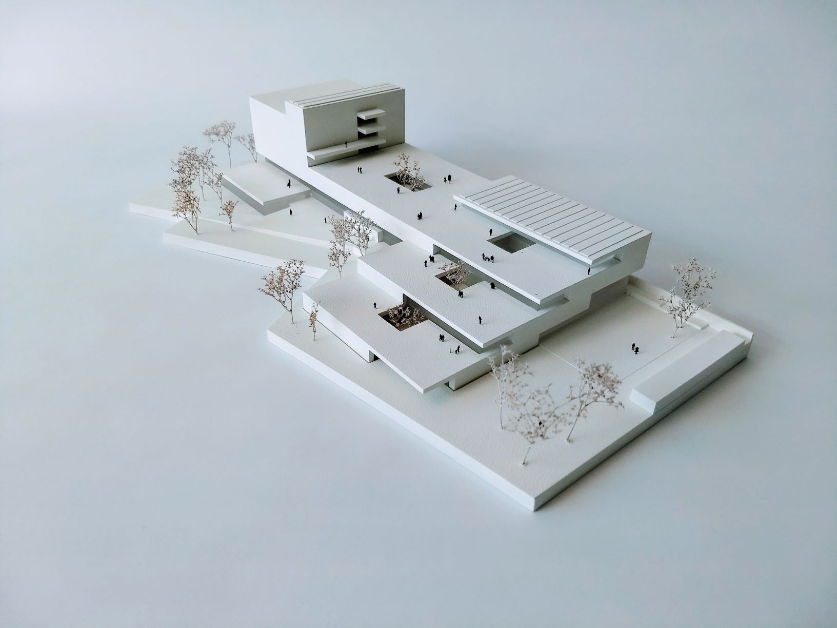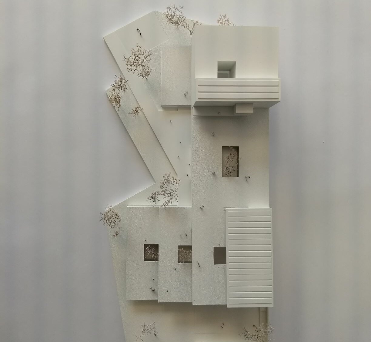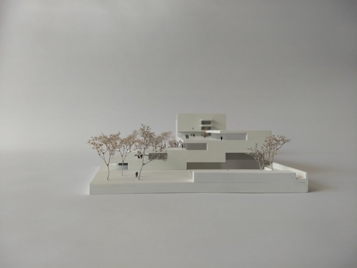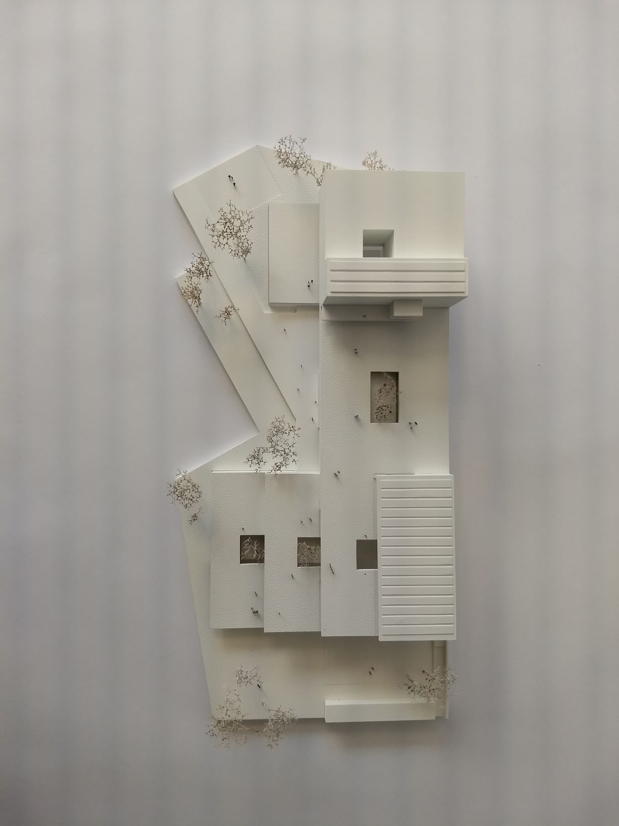 Zwei äußere Bedingungen bilden die Grundlage für den vorgeschlagenen Entwurf; die unterschiedlichen Niveaus von Straße und Campus-Gelände und der Zuschnitt des bebaubaren Areals. Das Gebäude wird in Fortsetzung des Bestandes im Westen an die Landgutgasse gesetzt. Während es im Westen terrassenförmig in das Gelände eingebettet ist, wird am östlichen Ende beim Zugang zum Quartiersplatz durch die Geschoßigkeit ein städtebaulicher Akzent gesetzt. Diese Grundintention der Baumassenverteilung folgt der Logik der inneren Organisation; der Situierung der Volksschule und der Kinderkrippe mit unmittelbarem Freiraumbezug im Westen und der Lage der neuen Mittelschule im Osten.