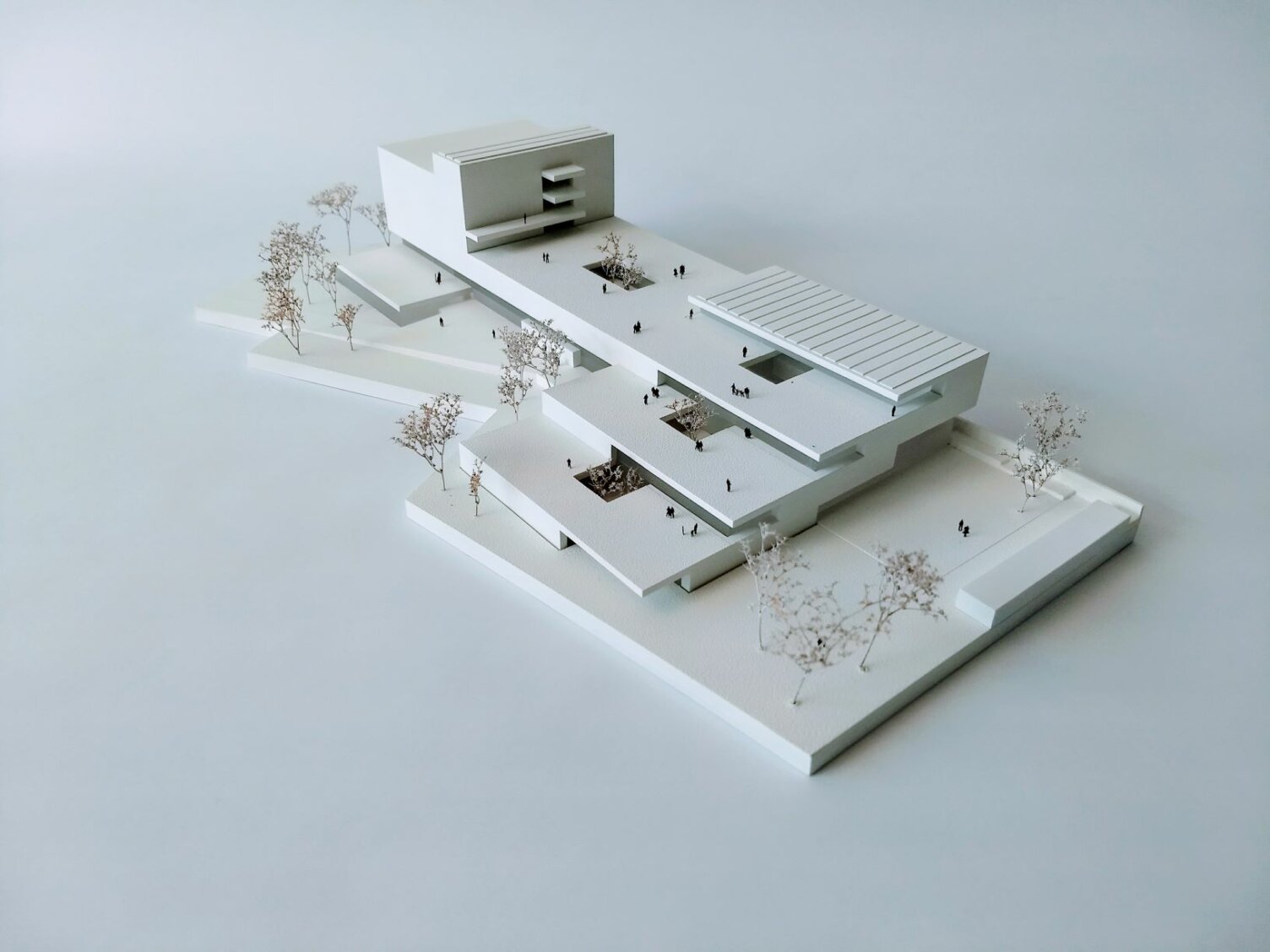 Der Hauptzugang erfolgt über eine dreiprozentige Rampe vom Quartiersplatz und die Nebenzugänge für die Ver- und Entsorgung sowie die erforderlichen Parkplätze und Ladezonen werden an der Landgutgasse verortet. Der Hauptzugang ist mit den entsprechenden Vorbereichen für Scooter und Fahrräder zweigeteilt, um die Schülerströme schon vor dem Schulgebäude etwas zu entflechten. Die großzügige Dimensionierung dieser Rampe ermöglicht es, dass diese zusammen mit dem vorgelagerten Grünraum auch als Pausenraum genutzt werden. Durch die Geometrie des Gebäudes kann der überwiegende Teil der Dachflächen in das Freiflächenkonzept integriert werden sodass damit auf dem knapp bemessenen Grundstück auch die statistischen Werte stimmen. In Ergänzung zu den teilweise befestigten und teilweise begrünten Dachflächen wird die Westfassade des ostseitigen Baukörpers mit einer vertikalen Begrünung vorgeschlagen.