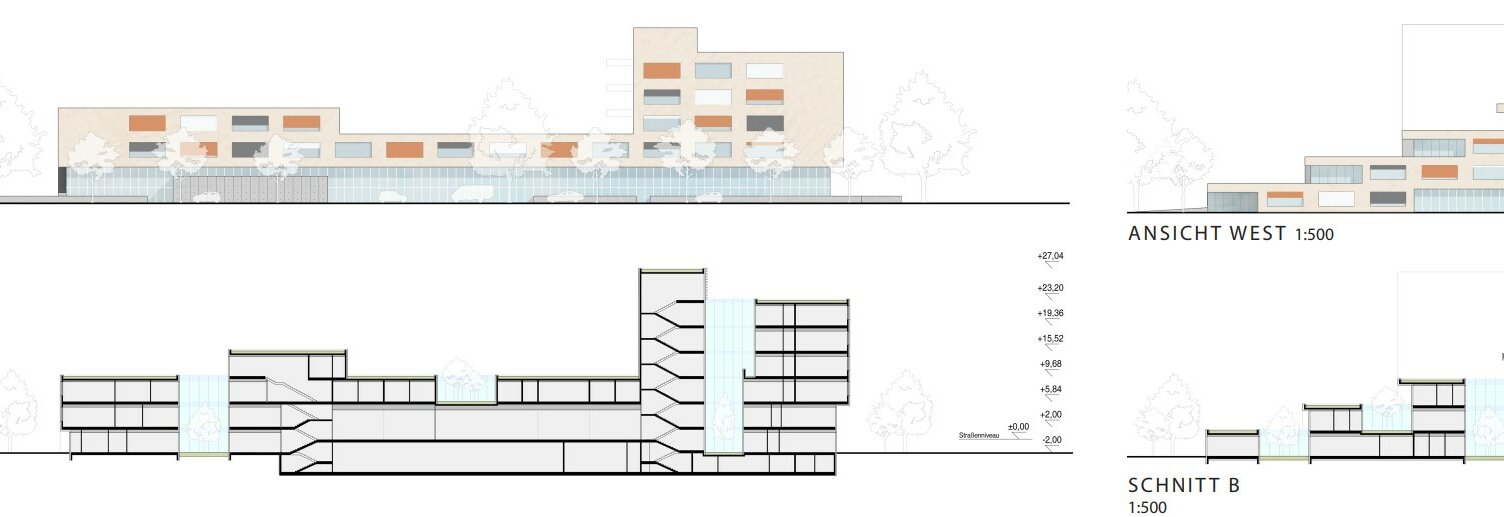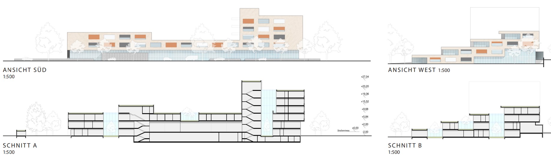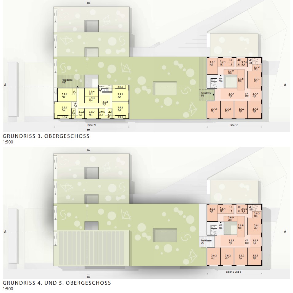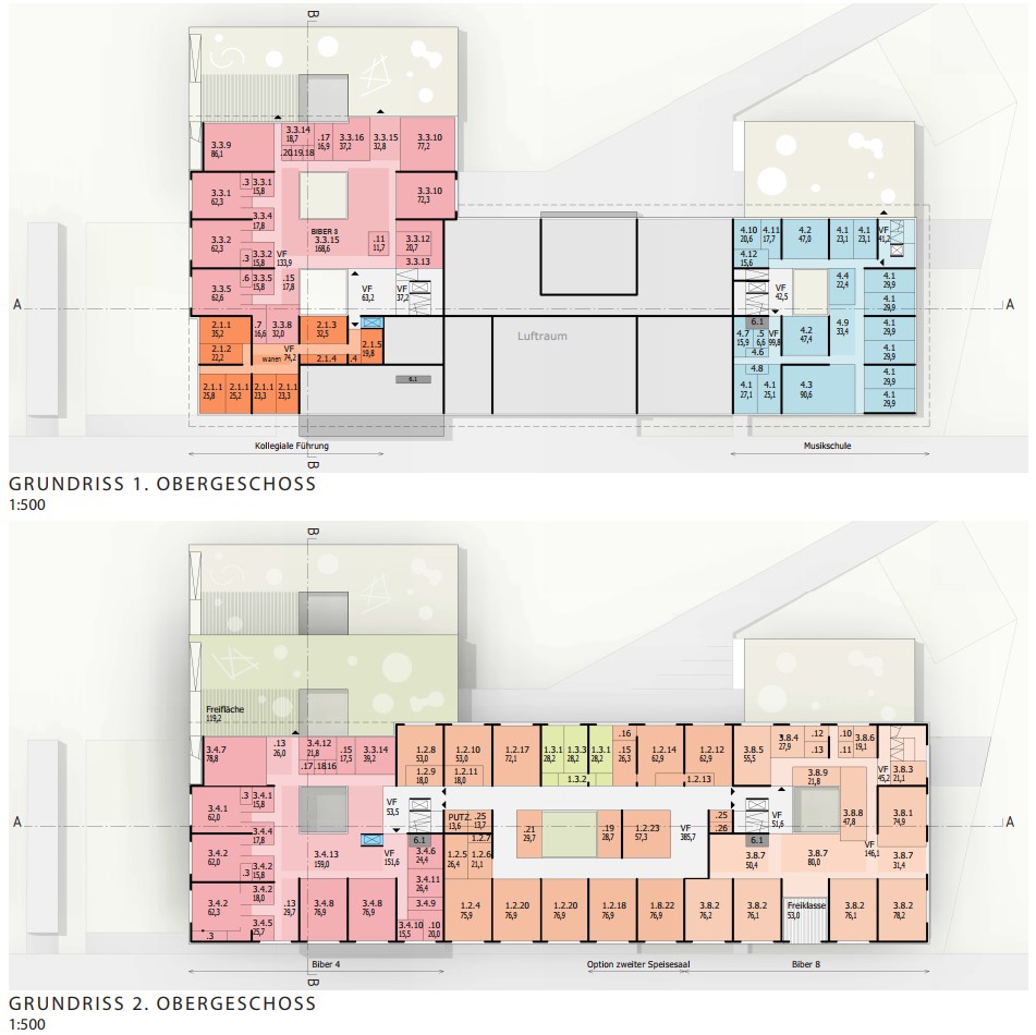 Die beiden Schulstufen sind zwar unmittelbar miteinander verbunden und durch gemeinsam genutzte Räumlichkeiten auch miteinander verschränkt aber trotzdem als eigene Bildungseinheiten lesbar. Der 9. Biber wird als eigenständiger Bereich über der Volksschule positioniert, die Musikschule und der Sportbereich unter der neuen Mittelschule. Da für beide ein externer Zugang erforderlich ist, liegen sie übereinander. Der Niveausprung wird genützt, indem die Aula mit Bibliothek, Veranstaltungssaal und Speisesaal eineinhalbgeschoßig ausgebildet und die beiden Schulbereiche Split-Level-artig angeschlossen werden. In der verbindenden Spange darüber werden die gemeinsam genutzten Sonderunterrichtsräume angeordnet.