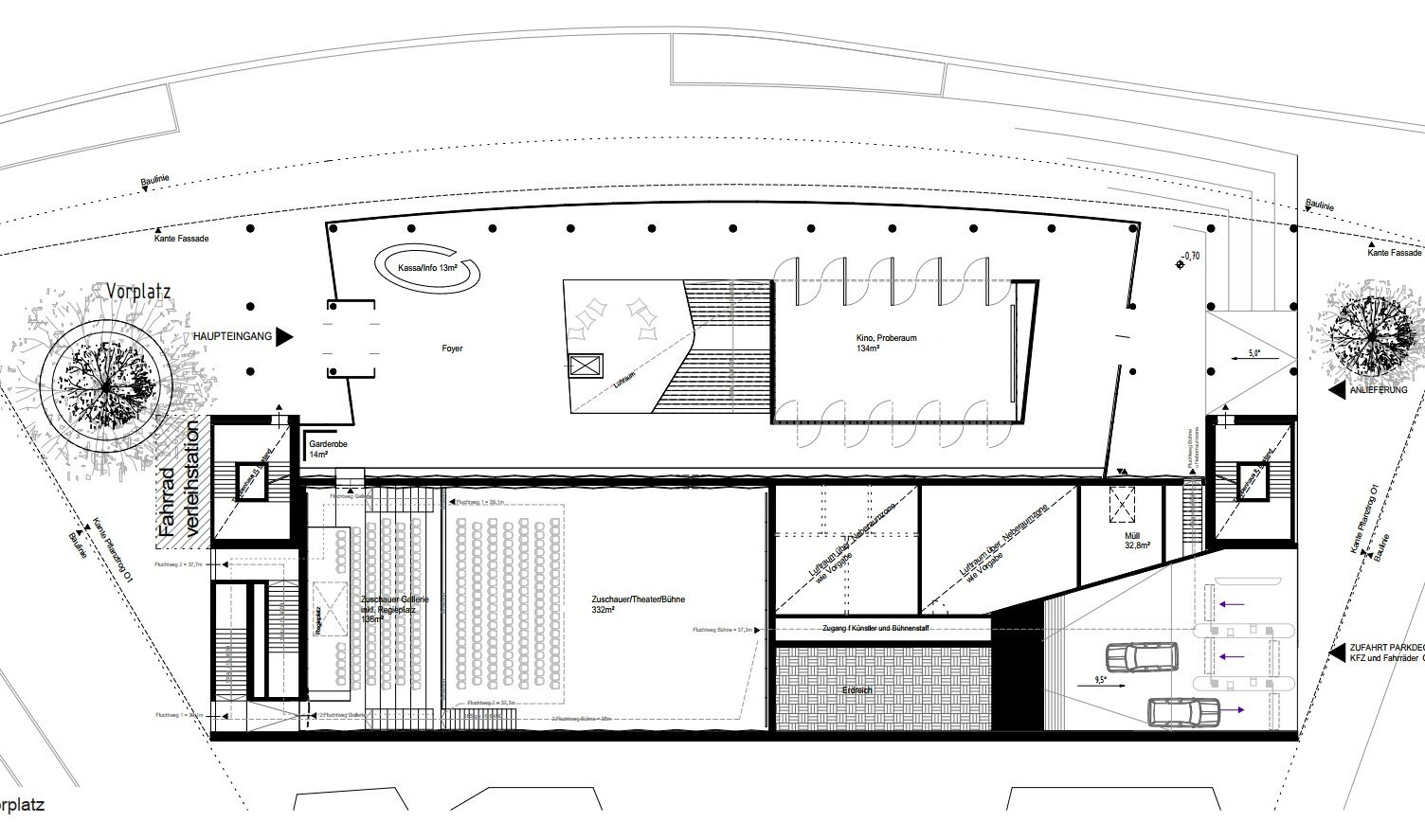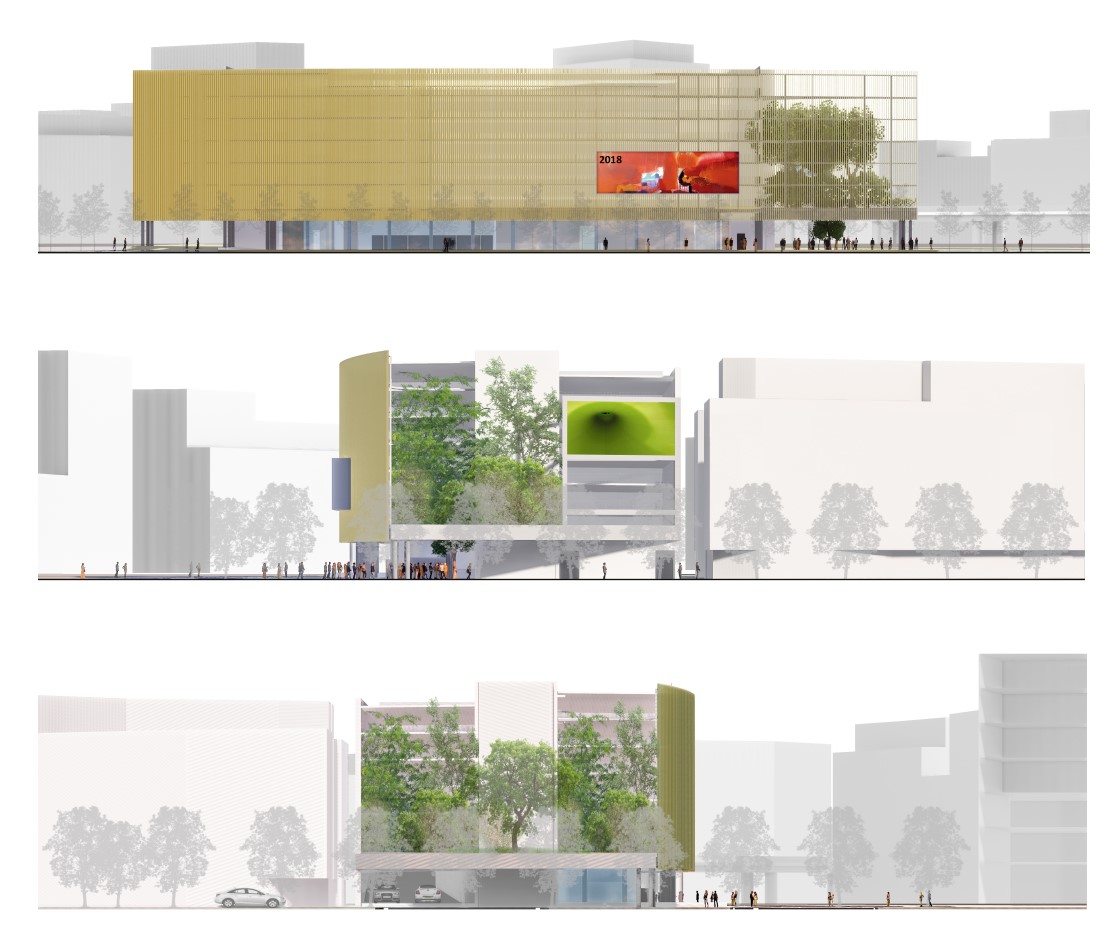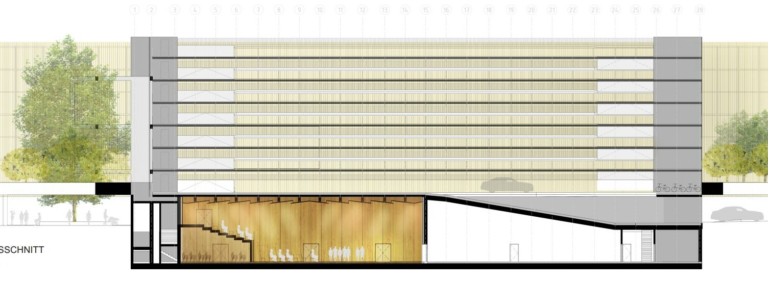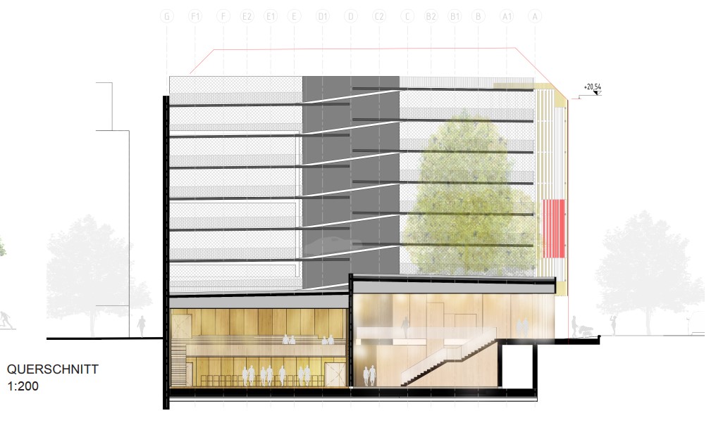 Die leicht gekrümmte Fassade Richtung Norden mit einem integriertem “screen” besteht aus perforierten und gekanteten Aluminiumprofilen, die vom Hauptzugang gesehen ein geschlosseneres und von der anderen Seite ein sehr transparentes Bild vermitteln. Damit wird beim Betreten der Veranstaltungsräumlichkeiten der Fokus auf den Eingang gerichtet, während von Nordosten die Garagenstruktur in den Vordergrund rückt. Durch die Neuorganisation des Erdgeschoßes entsteht Richtung Straße eine durchgängige Glasfront, hinter der die Organisation und Bespielung des Foyers sichtbar wird. Die hinter den Bepflanzungen zurücktretenden Ost- und Westfassaden des Garagengebäudes werden mit einem möglichst transparenten Stahlnetz gesichert.