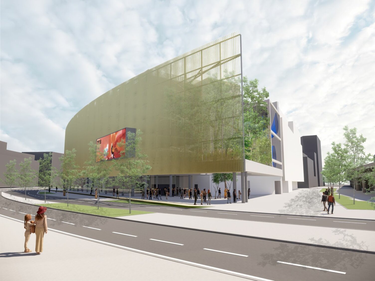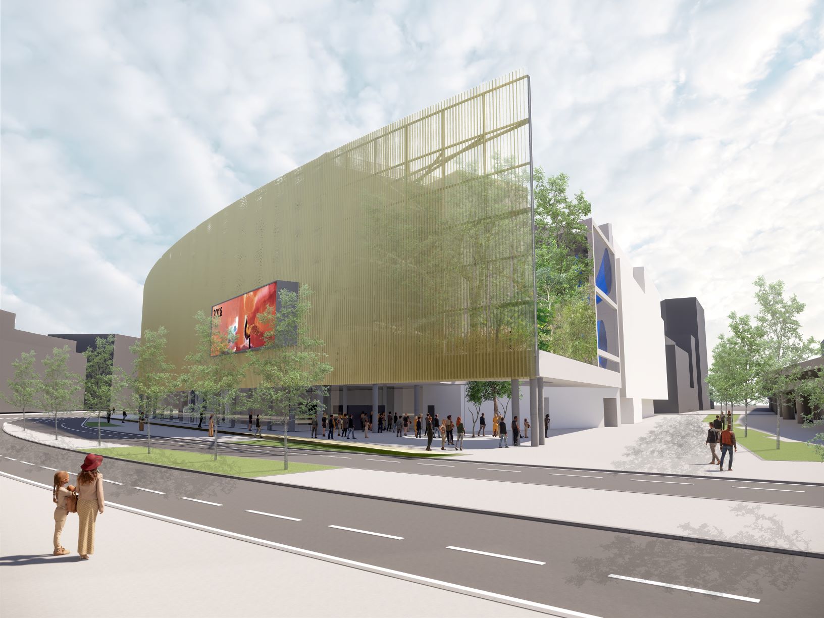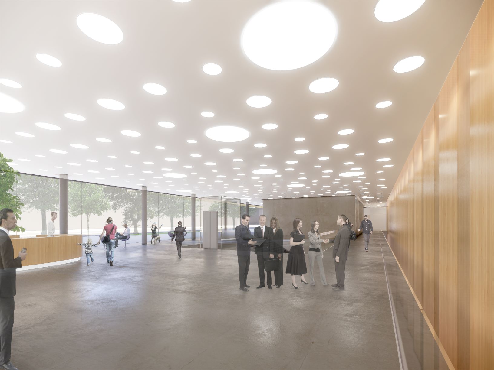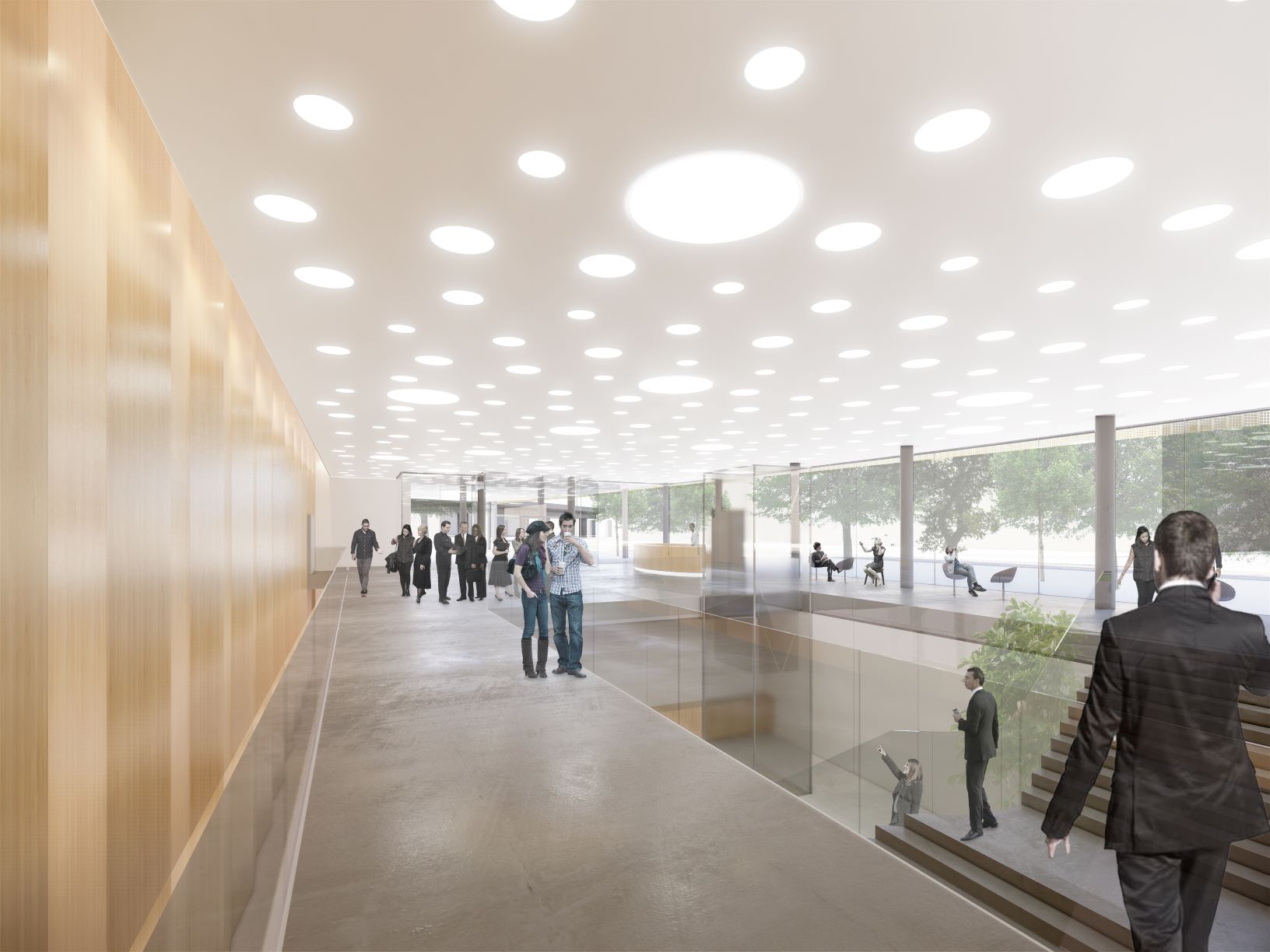 Die leicht gekrümmte Fassade Richtung Norden mit einem integriertem “screen” besteht aus perforierten und gekanteten Aluminiumprofilen, die vom Hauptzugang gesehen ein geschlosseneres und von der anderen Seite ein sehr transparentes Bild vermitteln. Damit wird beim Betreten der Veranstaltungsräumlichkeiten der Fokus auf den Eingang gerichtet, während von Nordosten die Garagenstruktur in den Vordergrund rückt. Durch die Neuorganisation des Erdgeschoßes entsteht Richtung Straße eine durchgängige Glasfront, hinter der die Organisation und Bespielung des Foyers sichtbar wird. Die hinter den Bepflanzungen zurücktretenden Ost- und Westfassaden des Garagengebäudes werden mit einem möglichst transparenten Stahlnetz gesichert.