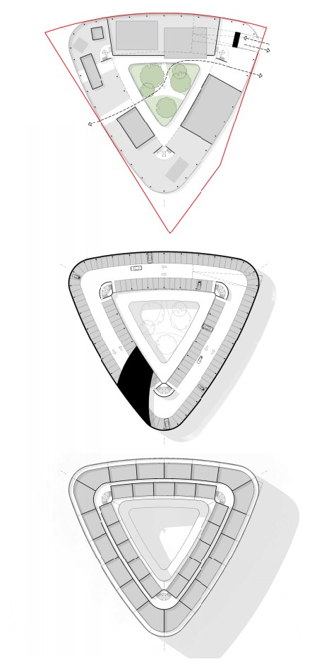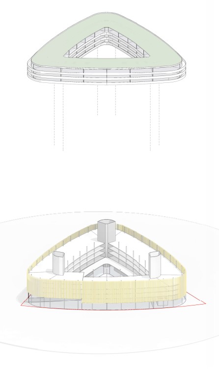 Im vorgeschlagenen Entwurf werden die bestehenden Brüche durch klarere Konturen geglättet. Richtung Sonnenallee ist eine Fassade konzipiert, die sich in die ringförmige Grundstruktur des städtebaulichen Masterplans einfügt. Durch den Zuschnitt des Grundstücks und das rechteckige Garagenbauwerk entstehen sowohl im Osten wie im Westen dreieckförmige Restvolumina, die ab dem ersten Obergeschoß dicht begrünt werden und damit ein geschlosseneres Straßenbild erzeugen. Erwähnt sei in diesem Zusammenhang, dass es sich dabei nur um eine Korrektur der vorliegenden Planung handelt. Teile dieser Volumina könnten, wie dargestellt, auch für temporäre künstlerische Interventionen genutzt werden.