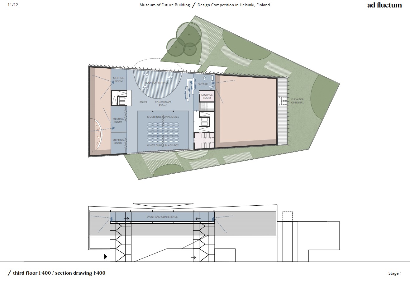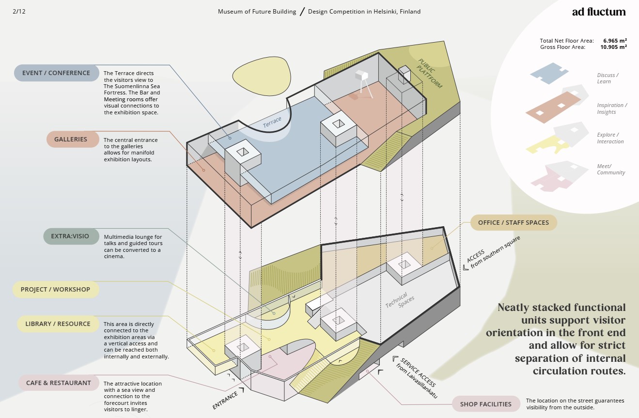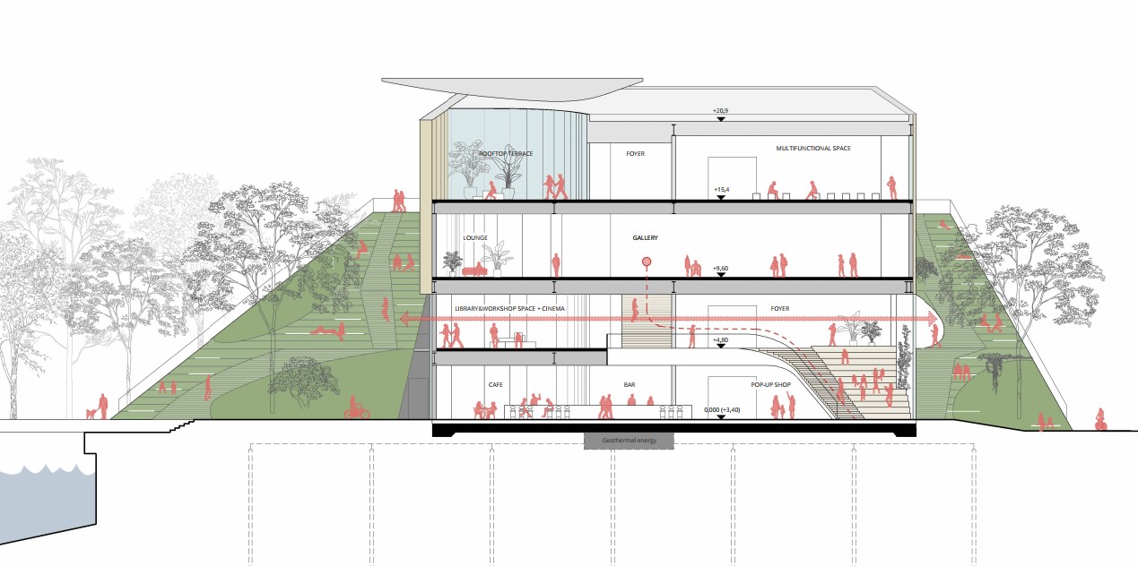 Complementary to the introspective nature of the exhibition white cube, the building envelope opens around the public areas, framing the city as object of the museum.