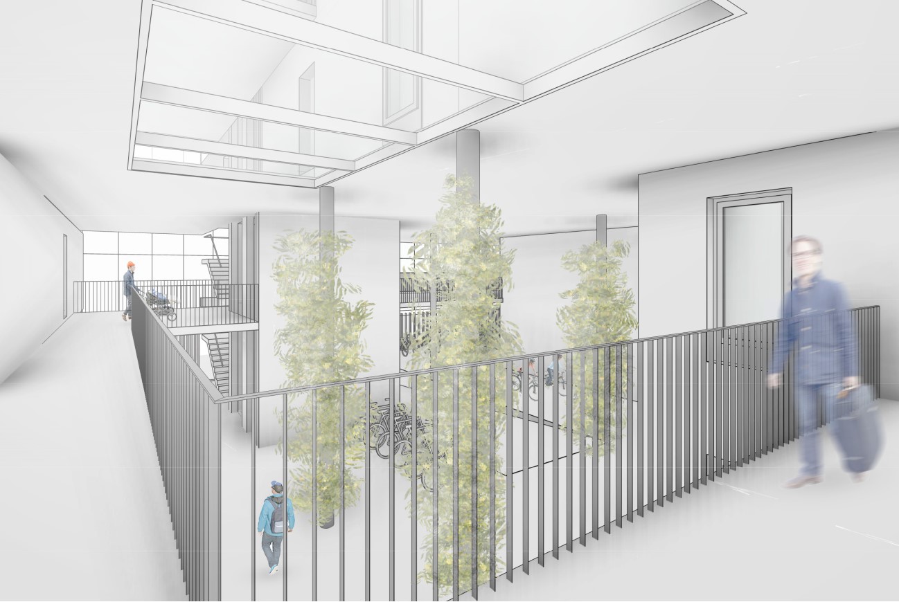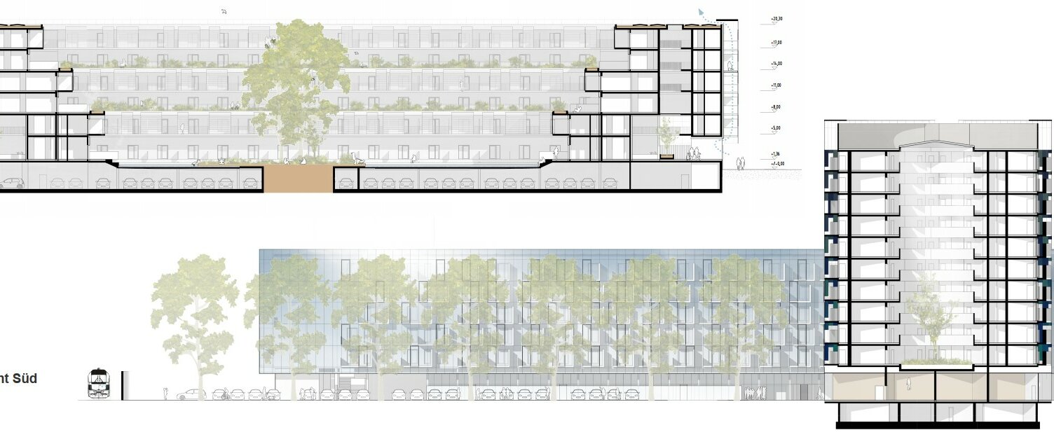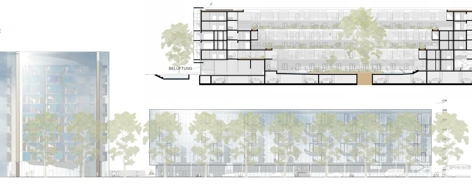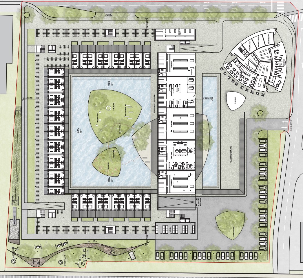 Die Nachhaltigkeit des neuen Stadtteilzentrums ist erst nachzuweisen. Dabei werden neue Mobilitätsangebote für die zukünftigen BewohnerInnen von großer Bedeutung sein. Energetisch wird vorgeschlagen, das Gebäude mit Hilfe einer Geothermieanlage in Komibination mit Photovoltaik wärme- und kältetechnisch zu versorgen. Überschüssige Energie im Sommer kann mittels 'free cooling' zur Kühlung der Wasserfläche im Hof herangezogen werden, um ein angenehmes Mikroklima zu gewährleisten. Die Energieentnahme im Sommer wie im Winter ist ausgeglichen. Die gewerblichen Flächen sind um den öffentlichen Raum im Süden situiert, der aufgrund des fließenden Verkehrs etwas von den Straßen zurückversetzt ist. Es sind mehrere kleine Einheiten einschließlich eines Gastronomieangebotes geplant, die Flächen sind jedoch sehr flexibel bespielbar.