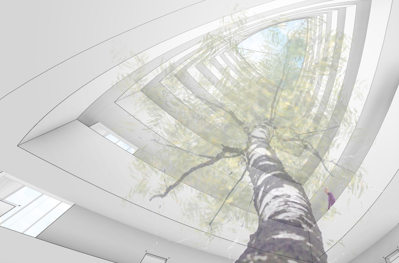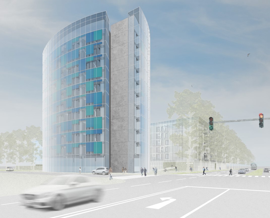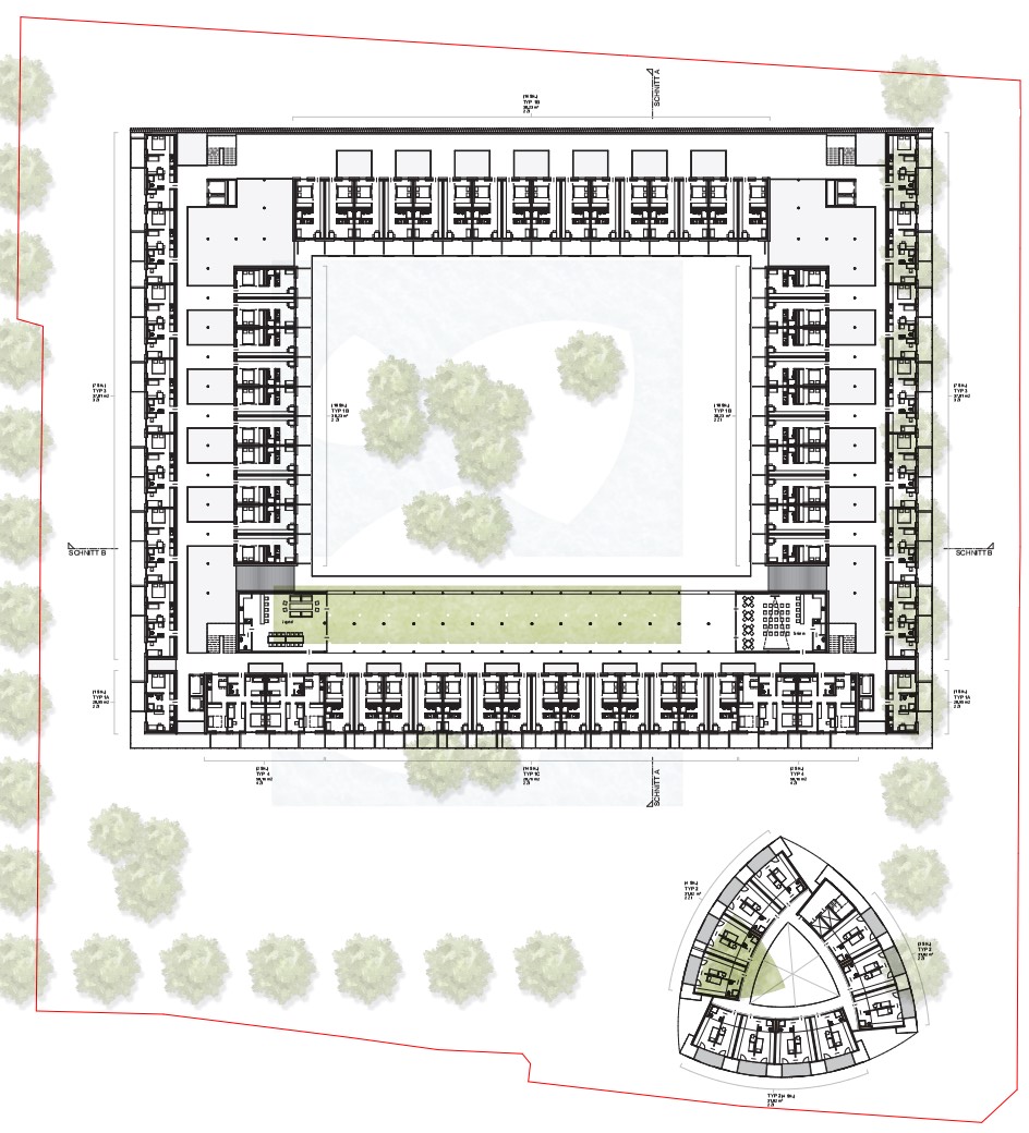 Die Idee eines neuen Stadteilzentrums unmittelbar an der Grenze zur Nachbargemeinde Feldkirchen erfordert insbesondere durch die Schallbelastung der angrenzenden Straßen und Eisenbahntrasse eine besondere Betrachtungsweise. Zwei eigenständige und klar differenzierte Baukörper verschaffen dem Ort eine eigene Charakteristik. Der Zentrumsgedanke findet seine städtebaulich-architektonische Entsprechung im weithin sichtbaren Solitärbaukörper an der Kreuzung. Dahinter entwickelt sich eine nach innen terrassierte Blockrandbebauung, die im Kontrast zum umgebenden Lärm eine den BewohnerInnen vorbehaltene Ruhezone umschließt. Mit dichter Bepflanzung und einer flachen aber großen Wasserfläche soll ein Mikroklima mit einer Atmosphäre erzeugt werden, das dem Schutzbedürfnis und dem Wunsch nach Rückzug entspricht. Durch die gewählten Geometrien entsteht jeweils ein Innen und Außen; den Einen als Erholungszone gewidmet, den Anderen als öffentlicher Raum. Die Trennung ist zwingend und gewollt.
