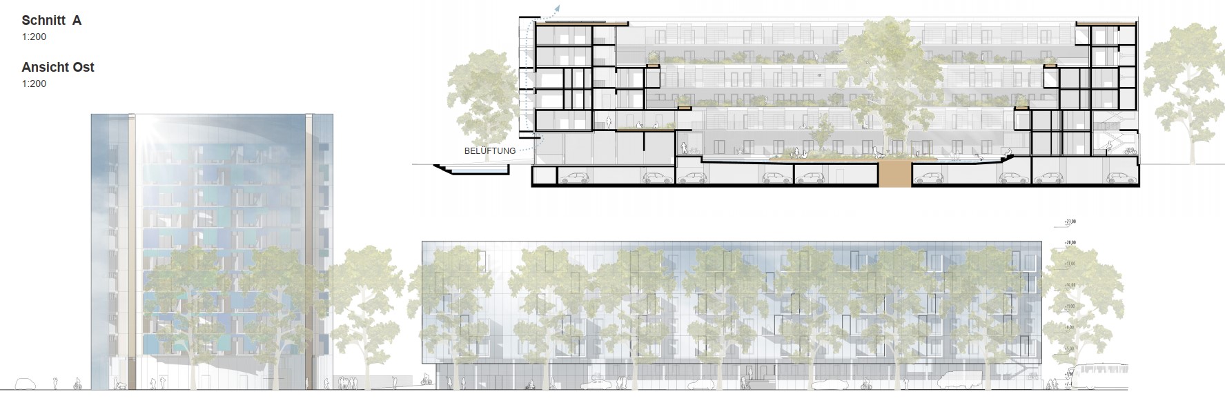 Die Nachhaltigkeit des neuen Stadtteilzentrums ist erst nachzuweisen. Dabei werden neue Mobilitätsangebote für die zukünftigen BewohnerInnen von großer Bedeutung sein. Energetisch wird vorgeschlagen, das Gebäude mit Hilfe einer Geothermieanlage in Komibination mit Photovoltaik wärme- und kältetechnisch zu versorgen. Überschüssige Energie im Sommer kann mittels 'free cooling' zur Kühlung der Wasserfläche im Hof herangezogen werden, um ein angenehmes Mikroklima zu gewährleisten. Die Energieentnahme im Sommer wie im Winter ist ausgeglichen. Die gewerblichen Flächen sind um den öffentlichen Raum im Süden situiert, der aufgrund des fließenden Verkehrs etwas von den Straßen zurückversetzt ist. Es sind mehrere kleine Einheiten einschließlich eines Gastronomieangebotes geplant, die Flächen sind jedoch sehr flexibel bespielbar.