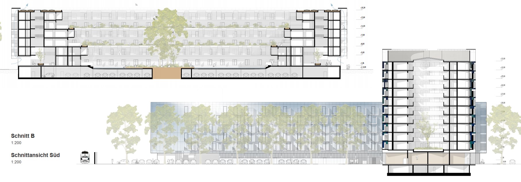 Die Idee eines neuen Stadteilzentrums unmittelbar an der Grenze zur Nachbargemeinde Feldkirchen erfordert insbesondere durch die Schallbelastung der angrenzenden Straßen und Eisenbahntrasse eine besondere Betrachtungsweise. Zwei eigenständige und klar differenzierte Baukörper verschaffen dem Ort eine eigene Charakteristik. Der Zentrumsgedanke findet seine städtebaulich-architektonische Entsprechung im weithin sichtbaren Solitärbaukörper an der Kreuzung. Dahinter entwickelt sich eine nach innen terrassierte Blockrandbebauung, die im Kontrast zum umgebenden Lärm eine den BewohnerInnen vorbehaltene Ruhezone umschließt. Mit dichter Bepflanzung und einer flachen aber großen Wasserfläche soll ein Mikroklima mit einer Atmosphäre erzeugt werden, das dem Schutzbedürfnis und dem Wunsch nach Rückzug entspricht. Durch die gewählten Geometrien entsteht jeweils ein Innen und Außen; den Einen als Erholungszone gewidmet, den Anderen als öffentlicher Raum. Die Trennung ist zwingend und gewollt.