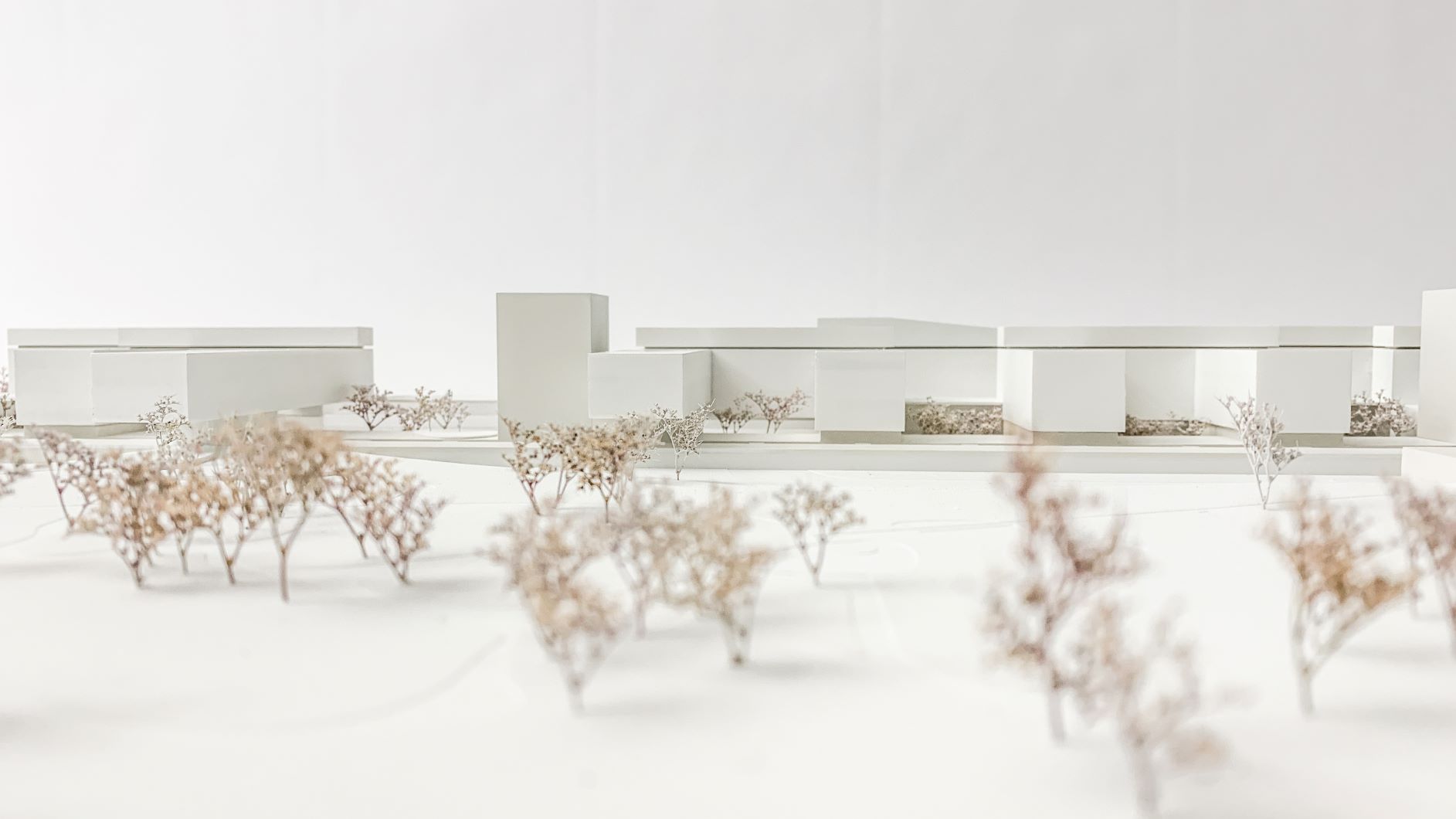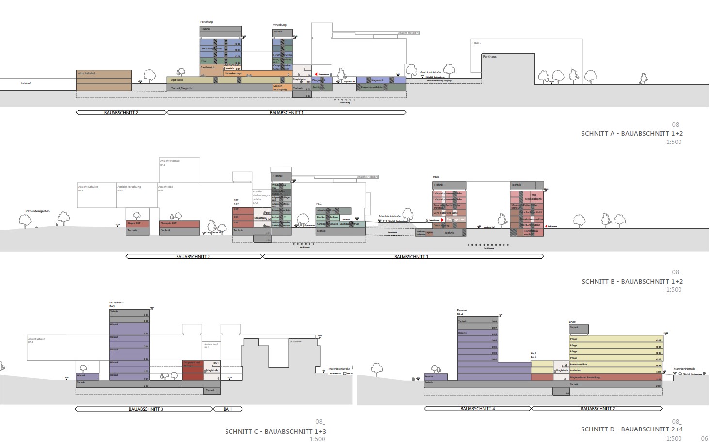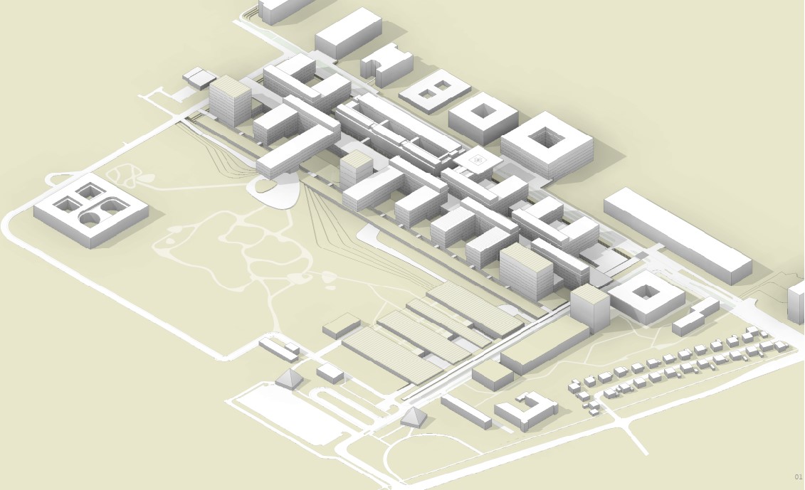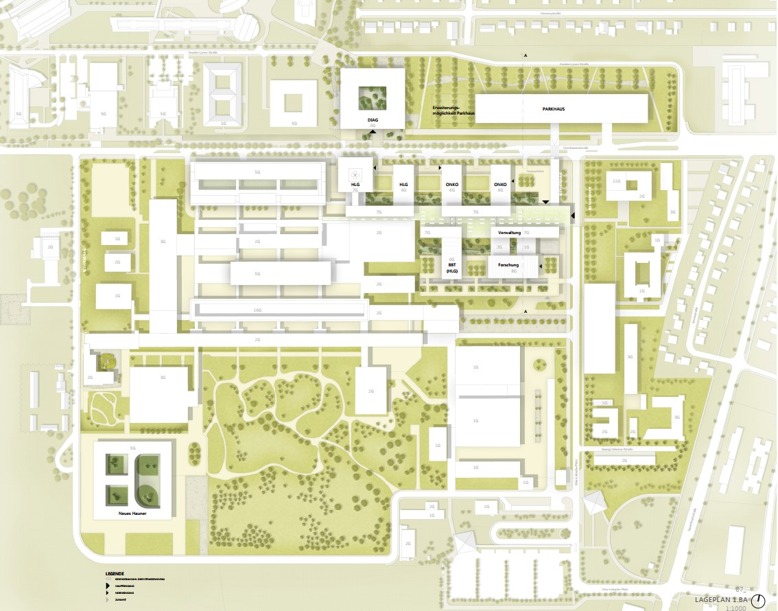 Durch die vorgeschlagenen Gebäudehöhen entfällt die Hochhausproblematik mit den damit verbundenen Mehrkosten für Bereiche mit Patientinnen und Patienten. Eine Ausnahme dieser Höhenbegrenzung wird in einer baulichen Zeile sichtbar, die durch vier Hochpunkte charakterisiert ist. Diese sind mit der Grundstruktur verwoben und betonen ausgewiesene städtebauliche Situationen. In diesen sind Funktionen verortet, die nicht dem unmittelbaren Krankenhausbetrieb zugeordnet sind. Die Flächen für Wirtschaft, Logistik und Energieversorgung werden schrittweise erneuert und wie bisher um den bestehenden Ladehof angesiedelt. Die Gestaltung erfolgt in Form einer Verschränkung von Parklandschaft und Bauwerk.