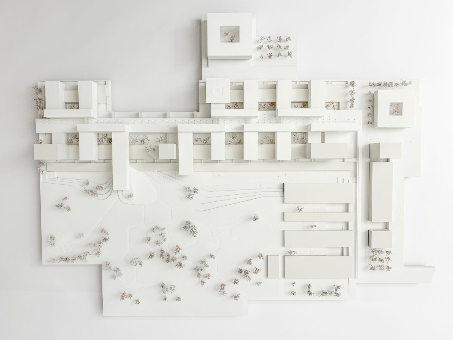Die Geometrie und Verteilung der Baukörper generiert eine Sequenz von Innenhöfen, die eine gute natürliche Belichtung in die Tiefe der Sockelgeschosse sicherstellt. Aus der subjektiven Sicht der BetrachterInnen führt das daraus entstehende räumliche Gefüge zu kleinteiligen Zonierungen, durch die die Maßstäblichkeit der mächtigen Kubatur relativiert wird. Offene Wartezonen entlang der Magistrale ermöglichen Sichtbeziehungen in die intensiv begrünten Innenhöfe. Auch dadurch wird die Orientierbarkeit innerhalb des Gebäudes verbessert.