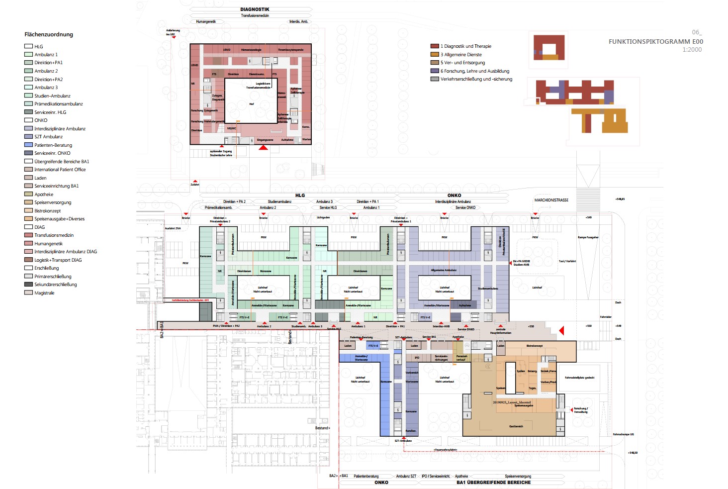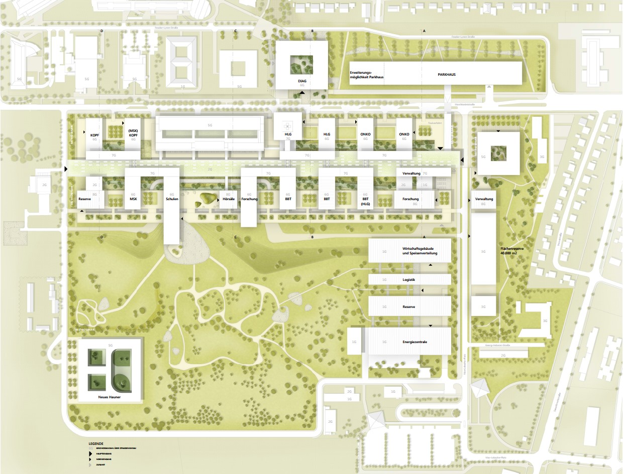 Das verbindende Element in der Gesamtanlage ist die Magistrale, die sich über das gesamte Grundstück erstreckt und in zwei Eingänge mündet. Entsprechend der Gewichtung sind diesen Portalen platzartige Erweiterungen vorgelagert, um die zu erwartenden Patienten und Besucherströme aufnehmen zu können; für das Personal sind teilweise entkoppelte Zugänge vorgesehen. Den vier Hauptgeschossen der Magistrale sind unterschiedliche Funktionen zugewiesen. Im Erdgeschoss erfolgt die Aufnahme und Verteilung von neuen Patient/-Innen und Besucher/-Innen.