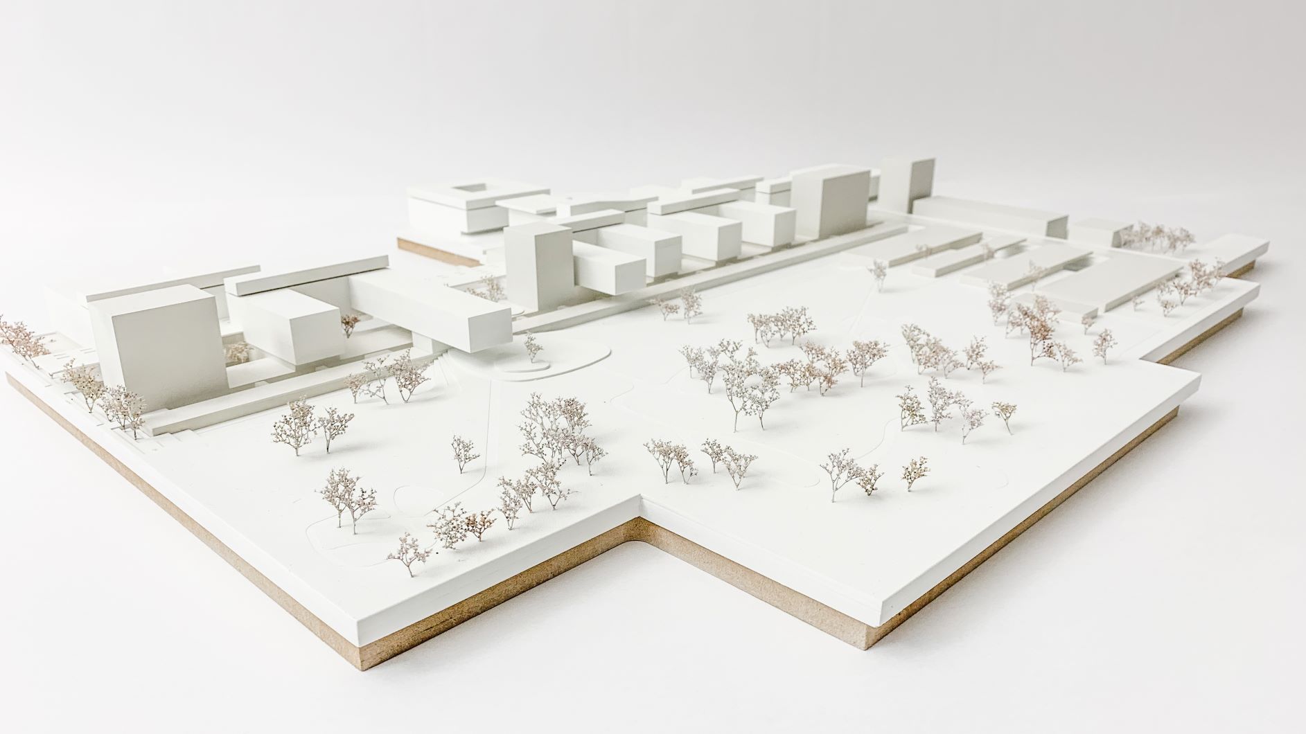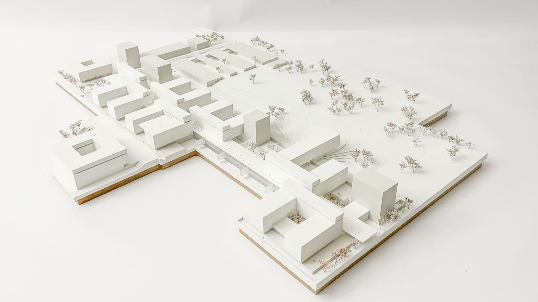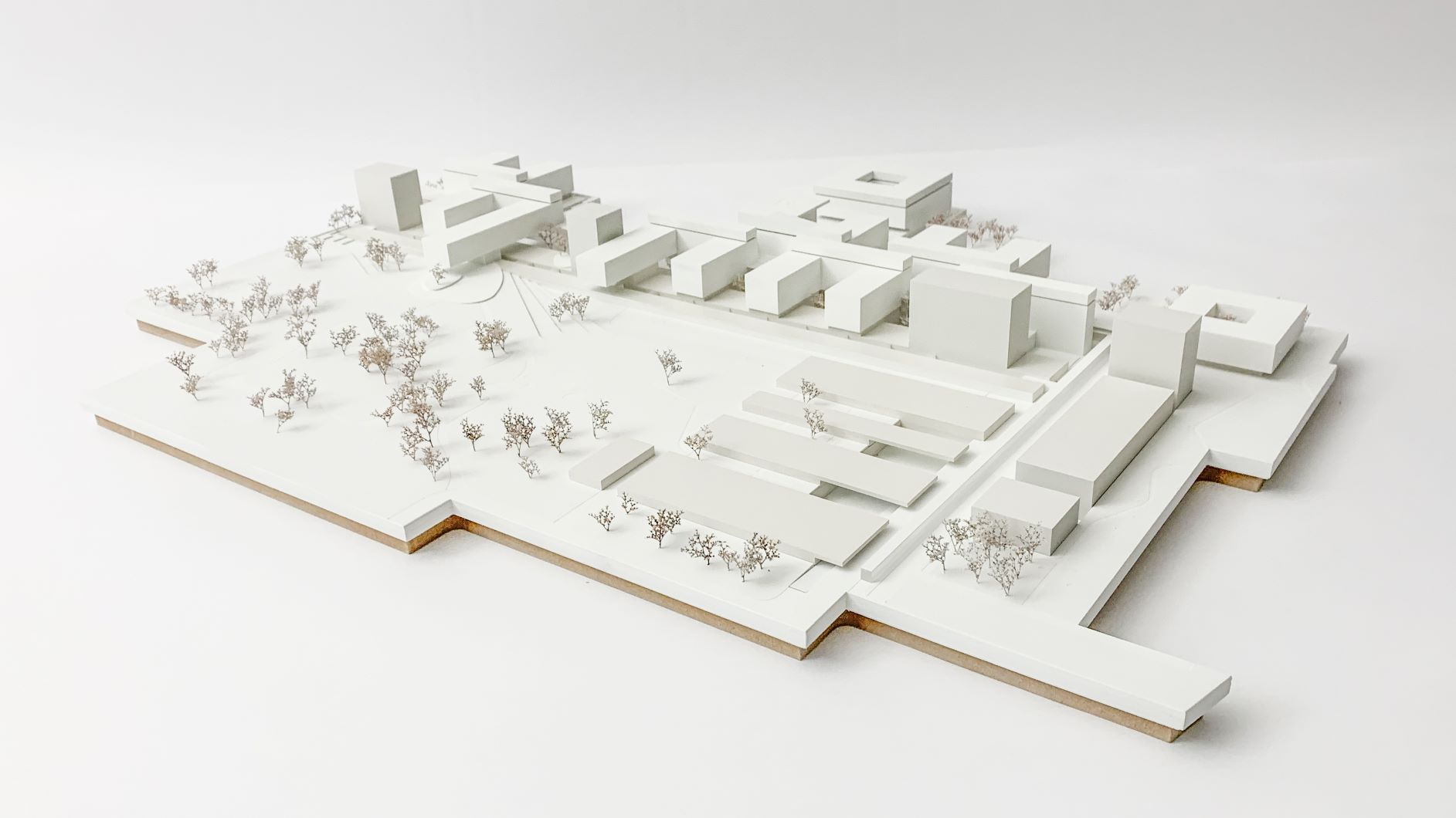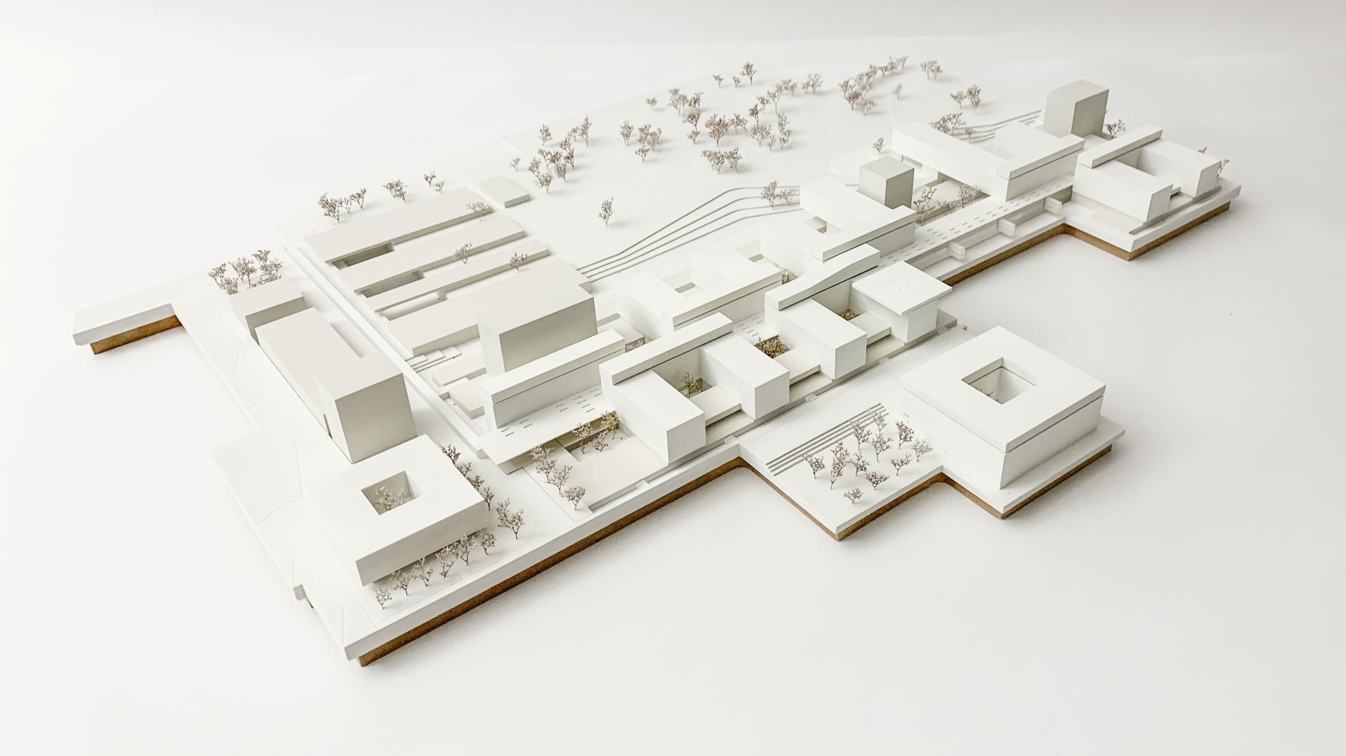 Durch die vorgeschlagenen Gebäudehöhen entfällt die Hochhausproblematik mit den damit verbundenen Mehrkosten für Bereiche mit Patientinnen und Patienten. Eine Ausnahme dieser Höhenbegrenzung wird in einer baulichen Zeile sichtbar, die durch vier Hochpunkte charakterisiert ist. Diese sind mit der Grundstruktur verwoben und betonen ausgewiesene städtebauliche Situationen. In diesen sind Funktionen verortet, die nicht dem unmittelbaren Krankenhausbetrieb zugeordnet sind. Die Flächen für Wirtschaft, Logistik und Energieversorgung werden schrittweise erneuert und wie bisher um den bestehenden Ladehof angesiedelt. Die Gestaltung erfolgt in Form einer Verschränkung von Parklandschaft und Bauwerk.