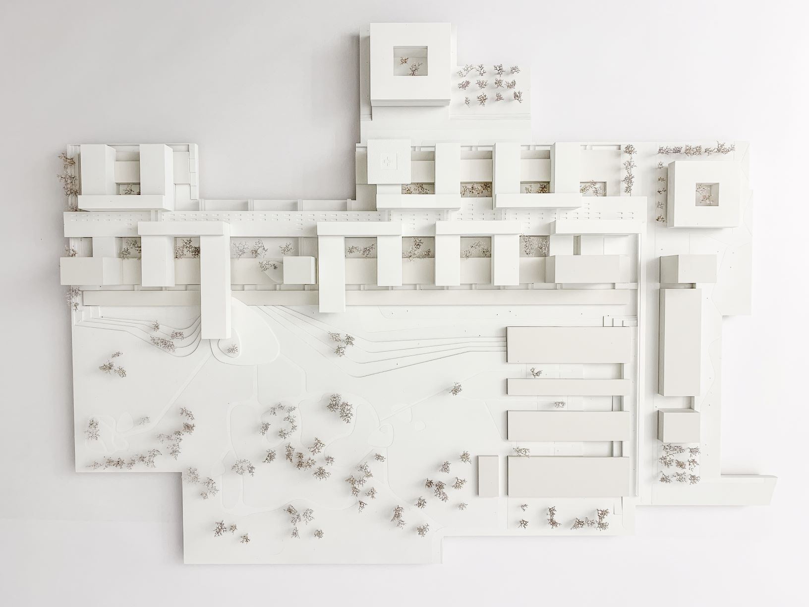 Die Geometrie und Verteilung der Baukörper generiert eine Sequenz von Innenhöfen, die eine gute natürliche Belichtung in die Tiefe der Sockelgeschosse sicherstellt. Aus der subjektiven Sicht der BetrachterInnen führt das daraus entstehende räumliche Gefüge zu kleinteiligen Zonierungen, durch die die Maßstäblichkeit der mächtigen Kubatur relativiert wird. Offene Wartezonen entlang der Magistrale ermöglichen Sichtbeziehungen in die intensiv begrünten Innenhöfe. Auch dadurch wird die Orientierbarkeit innerhalb des Gebäudes verbessert.